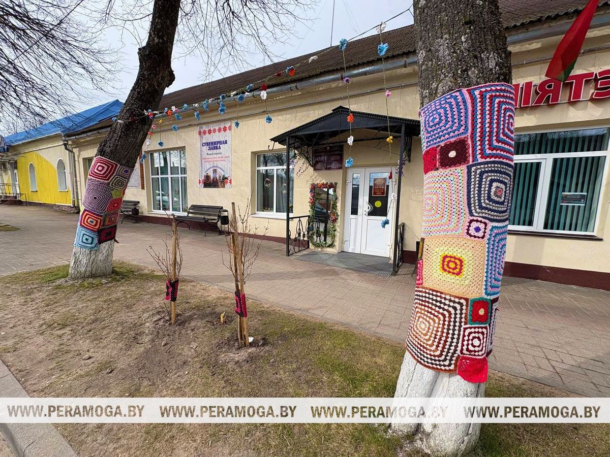 Стволы деревьев у Вилейского районного Центра народных ремесел и творчества преобразились: их плотно укутали в пёстрые полотна, выполненные в технике «бабушкин квадрат».