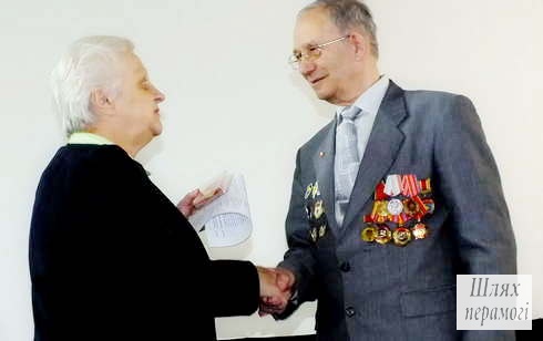 Председатель Вилейского районного совета ветеранов, первый секретарь районной организации КПБ Анна Шепелева вручила Якову Дрееру памятную медаль «100-лет Великой Октябрьской Социалистической революции «.
