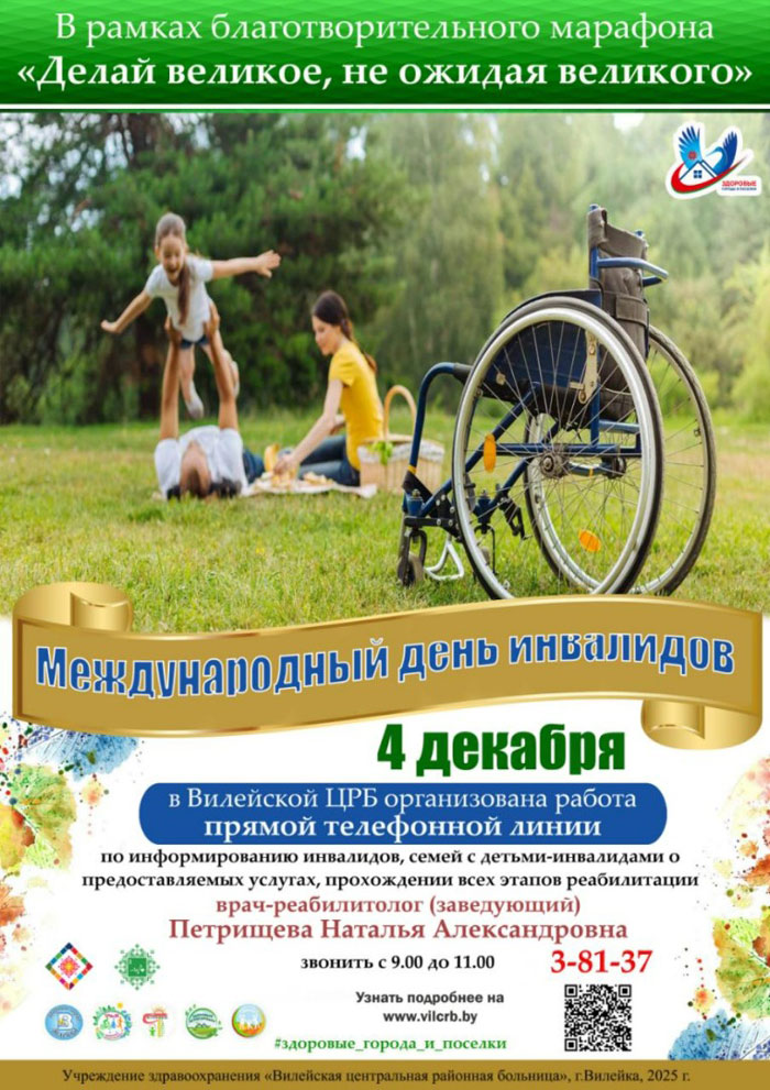 3 декабря – Международный день инвалидов. К этому дню в Вилейской ЦРБ 4 декабря будет организована работа «прямой телефонной линии» по информированию инвалидов, семей с детьми-инвалидами о предоставляемых услугах, прохождении всех этапов реабилитации.