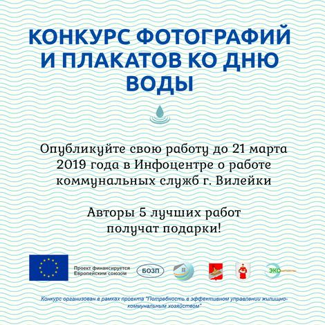 Для участия в конкурсе необходимо опубликовать в инфоцентре фото рек или озер Вилейщины, которые демонстрируют красоту водных ресурсов. Также можно опубликовать плакат, посвященный береженому отношению к водным ресурсам. Фотографии могут быть сделаны не только в марте 2019 года, но и ранее.