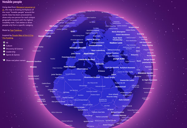 Все люди, чьи имена показаны на карте, оставили заметный след в истории человечества в период с 3500 г. до н.э. по 2018 г. н.э. Приближая и уменьшая онлайн-карту, можно рассмотреть, где именно они родились.