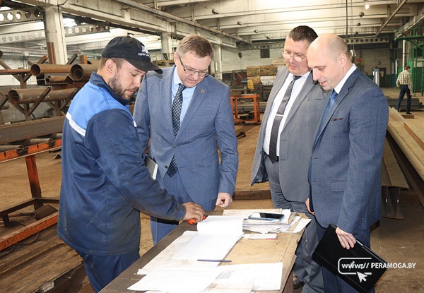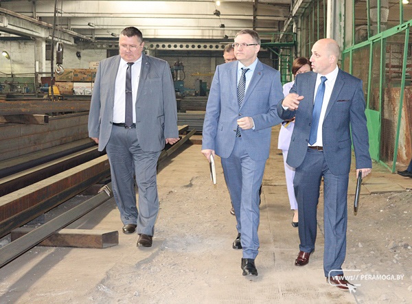 Рабочая поездка Министра продолжилась посещением Вилейского ремонтного завода. Первым делом Александр Червяков отправился в сердце предприятия, специализирующегося на производстве металлоконструкций и металлоизделий для современного строительства, – на производство. Директор Павел Потрепко провел гостя по производственным помещениям, поделился информацией о значимых объектах, построенных с участием ремзавода, и об актуальном портфеле заказов.