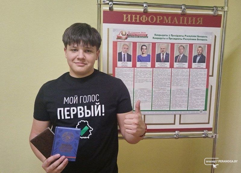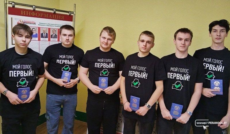 На Чапаевском участке для голосования №3 молодые люди активно выражают свою гражданскую позицию, голосуя в поддержку своего кандидата. Футболки с надписью «Мой голос — первый!» — подарок ребятам от Белорусского республиканского союза молодёжи.