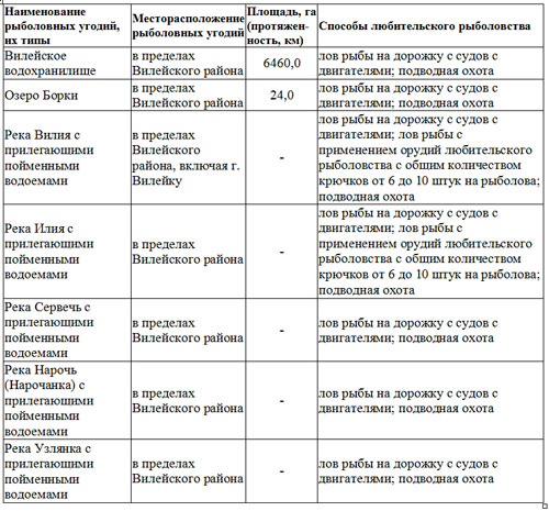 В указанный перечень входит ряд водных объектов Вилейского района. Так, лов рыбы на дорожку судов и подводная охота на территории Вилейского района запрещены на Вилейском водохранилище, озере Борки, реках Вилия, Илия, Сервечь, Нарочь (Нарочанка), Узлянка. Кроме того, в пределах Вилейского района на реках Вилия и Илия запрещен лов рыбы с применением орудий любительского рыболовства с общим количеством крючков от 6 до 10 штук на рыболова.