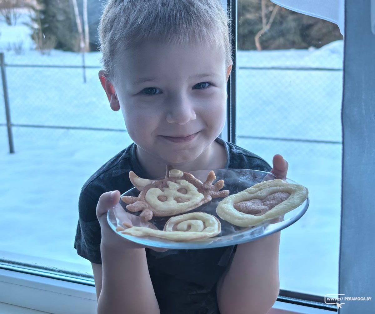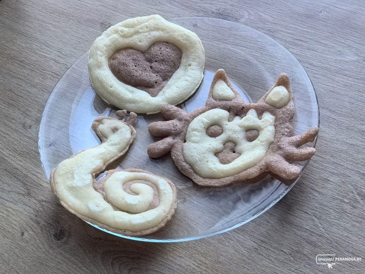 6. Приступаем к самой творческой части приготовления — выпеканию блинчиков. Используя два цвета теста, рисуем на разогретой сковороде желаемый рисунок. Для контура и деталей можно использовать шоколадную часть теста, а пустоты заполнить светлой.