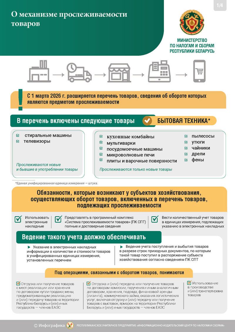 Инспекция Министерства по налогам и сборам по Вилейскому району напоминает, что с 1 марта 2026 года в перечень товаров, сведения об обороте которых являются предметом прослеживаемости, определенный постановлением Совета Министров Республики Беларусь от 23 апреля 2021 г. № 250 «О реализации Указа Президента Республики Беларусь от 29 декабря 2020 г. № 496», включены: машины стиральные бытовые, в том числе бывшие в употреблении; телевизоры, в том числе бывшие в употреблении; плиты (варочные панели) бытовые электрические; пылесосы, роботы-пылесосы бытовые; машины посудомоечные бытовые; комбайны кухонные бытовые; мультиварки электрические; утюги электрические; чайники электрические; печи микроволновые; дрели электрические; фены для волос.