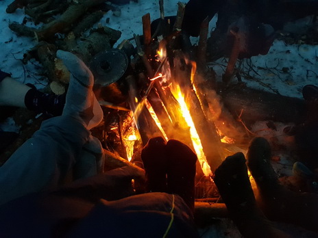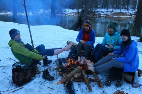 Бліжэй да пяці гадзін вечара, калі больш за дваццаць пяць кіламетраў па зімовым лесе былі пройдзены, мы натрапілі на цудоўную палянку прама на беразе Віліі. Паляна выглядала вельмі маляўніча, яна задавальняла нашы эстэтычныя пачуцці, таму было вырашана застацца на ёй. Палаткі разбілі прама на снезе, тэмпература была не надта нізкая, таму яловыя і хваёвыя лапкі не псавалі. Так як амаль цэлы дзень нам прыйшлося прабіваць шарпак, ногі ва ўсіх былі мокрыя, хоць выкручвай шкарпэткі. Таму першай справай было насячы і напілаваць дроў для вогнішча, што мы зрабілі хутка і з задавальннем.