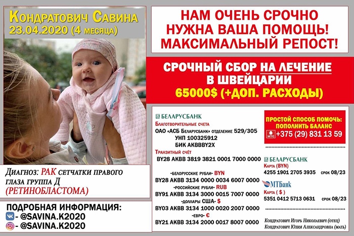 С огромной просьбой о помощи, к Вам обращается семья Кондратович, из города Минска. 12 августа 2020 года в наш дом пришла беда, младшая дочь Савина, в возрасте 4 месяцев, заболела самой страшной и беспощадной болезнью на земле.