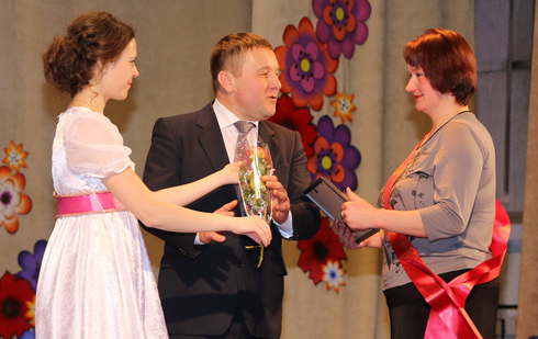 На здымку: на злёце перадавікоў Марыю Белую віншуе намеснік старшыні раённага выканаўчага камітэта Генадзь Касцевіч.