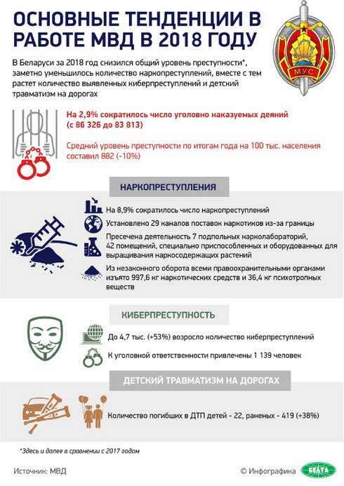 В Беларуси за 2018 год снизился общий уровень преступности (в сравнении с 2017 годом), заметно уменьшилось количество наркопреступлений, вместе с тем растет количество выявленных киберпреступлений и детский травматизм на дорогах, сообщает МВД Республики Беларусь.