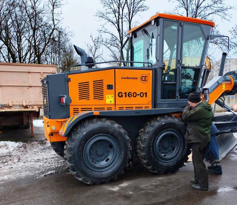 Это новенький грейдер G 160-01 — надёжный помощник в уходе за дорогами и подъездными путями. Эту технику выпускает белорусский Холдинг «Амкадор» — предприятие с многолетним опытом производства дорожной техники, которое уже не раз доказывало качество своей продукции на дорогах всей страны.