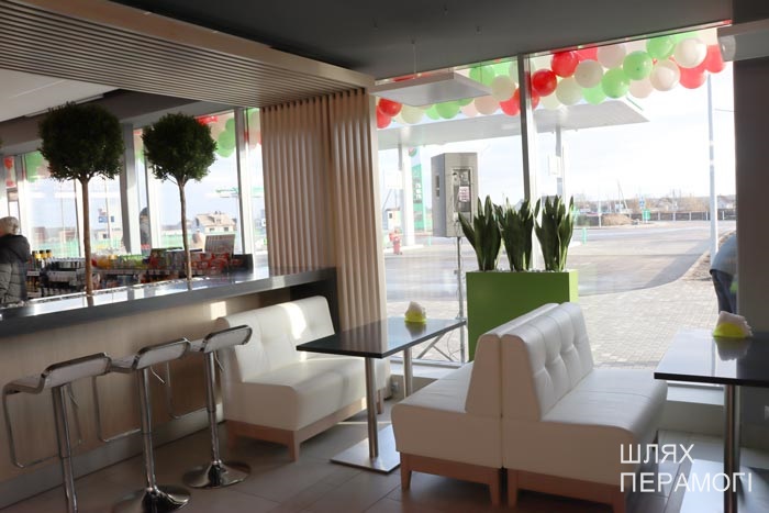 Новая автозаправка соответствует всем самым современным стандартам. АЗС может обслуживать до 250 автомобилей в сутки. В качестве бонуса для водителей – большой комплекс услуг: от подкачки шин до возможности передохнуть за чашкой чая или хорошего кофе в совмещенном торговом зале с кафетерием в фирменном стиле «Заўжды Цікава». В распоряжении клиентов – мягкие диваны и барная стойка. Кафетерий «Цікава» оборудован новейшими кофемашинами, а также мониторами. В меню для посетителей – выпечка, напитки, хот-доги.