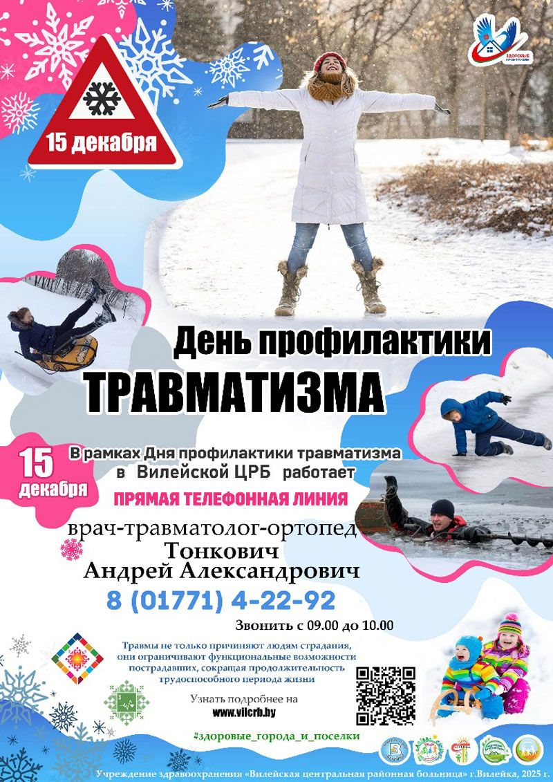 15 декабря – День профилактики травматизма. В этот день Вилейская ЦРБ проведет «прямую телефонную линию». Задать интересующие вопросы можно будет по номеру (801771)4-22-92 с 9.00 до 10.00 – врачу-травматологу-ортопеду Тонковичу Андрею Александровичу.
