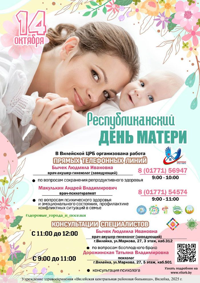 Республиканский День матери отмечается 14 октября. В этот день Вилейская ЦРБ организует работу «прямых телефонных линий». На связи будут: