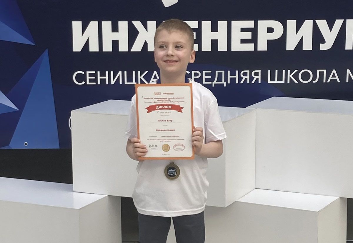 Егор Ягелло, учащийся кружка «Информатика+» Вилейского районного центра дополнительного образования детей и молодежи (педагог Новаш Н.Г.), награжден дипломом второй степени открытого роботурнира «Кубок по образовательной робототехнике» в номинации «Звездный десант (путь)» на базе Matatalab Tale-Bot.