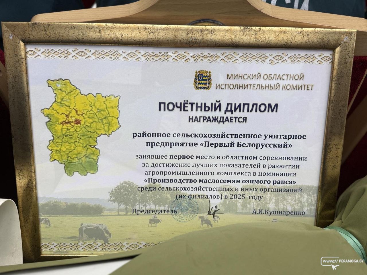 Районное сельскохозяйственное предприятие «Первый Белорусский» заняло первое место в областном соревновании за достижение лучших показателей в развитии АПК в номинации «Производство маслосемян озимого рапса» среди сельскохозяйственных и иных организаций.