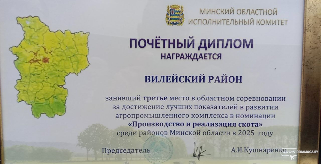 Почетным дипломом был также награжден Вилейский район, занявший третье место в областном соревновании за достижение лучших показателей в развитии АПК в номинации «Производство и реализация скота» среди районов минской области в 2025 году.