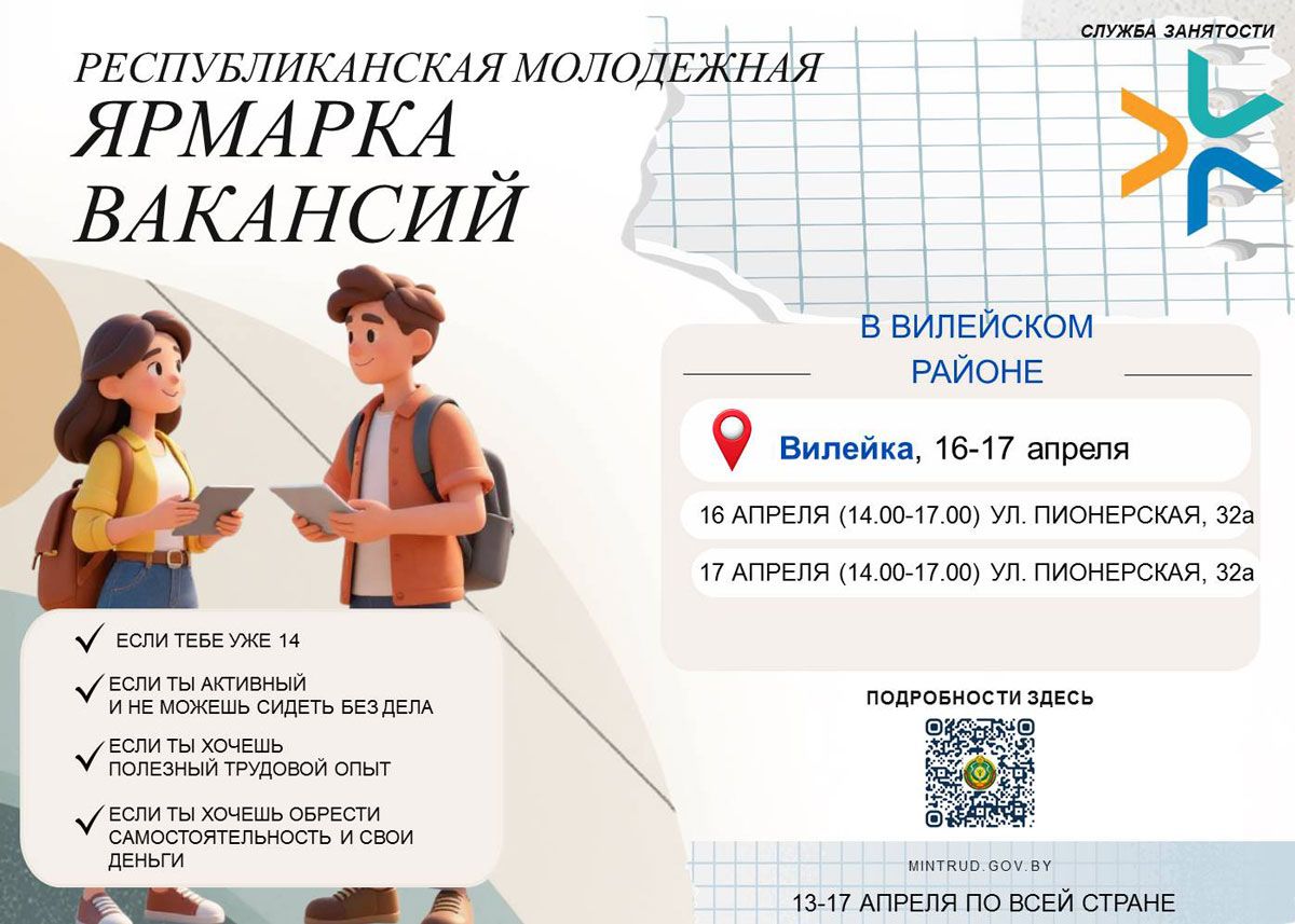 С 13 по 17 апреля 2026 года во всех регионах республики будет проводиться республиканская молодежная ярмарка вакансий. В Вилейском районе молодежная ярмарка вакансий состоится 16 и 17 апреля.