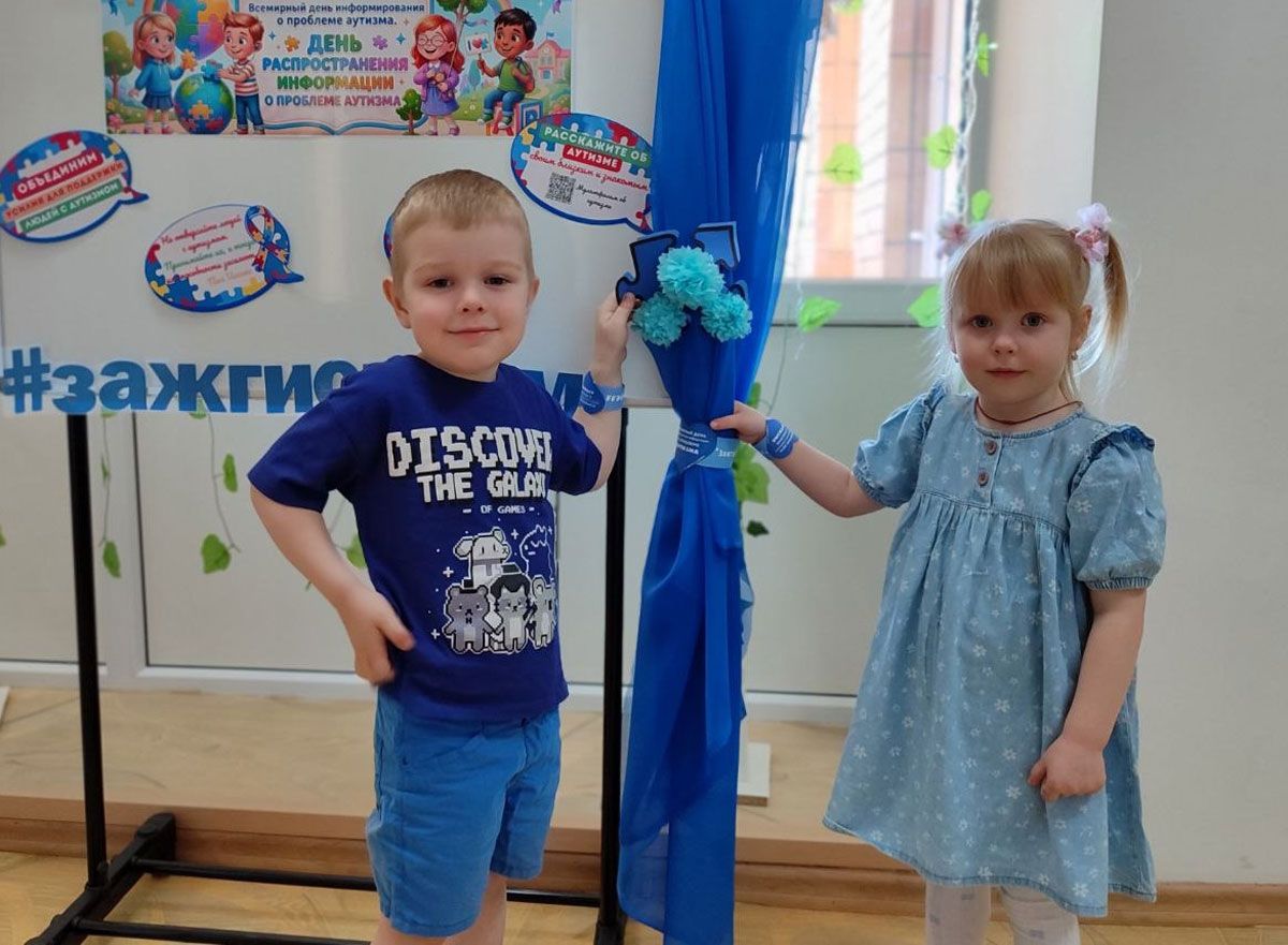 Утро началось с акции #зажгисиним. Все педагоги и воспитанники пришли в одежде оттенков синего — цвета, символизирующего поддержку людей с аутизмом. На руках у ребят и взрослых были информационные браслеты, а в группах разместили тематические листовки, рассказывающие о важности этого дня.