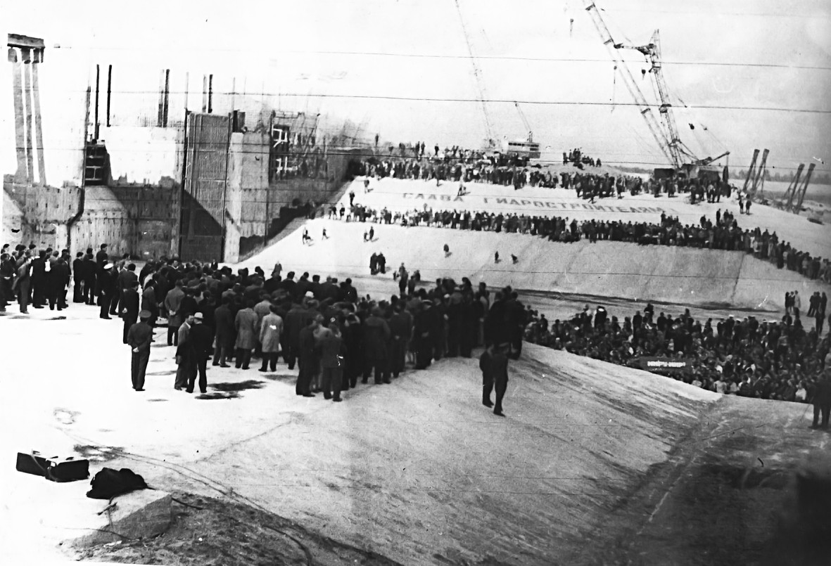 І вось самы хвалюючы момант. З каманднага пункта падаецца сігнал аб пачатку перакрыцця ракі. Усе бягуць да берага, да таго месца, дзе з абодвух бакоў узвышаюцца горы загадзя падрыхтаванага грунту, дзе на старце выстраіліся магутныя бульдозеры, упрыгожаныя лозунгамі і сцягамі. Нібы гром, загрукаталі маторы, здрыганулася зямля і ў ваду пасыпаліся тоны пяску, суглінку, камення.